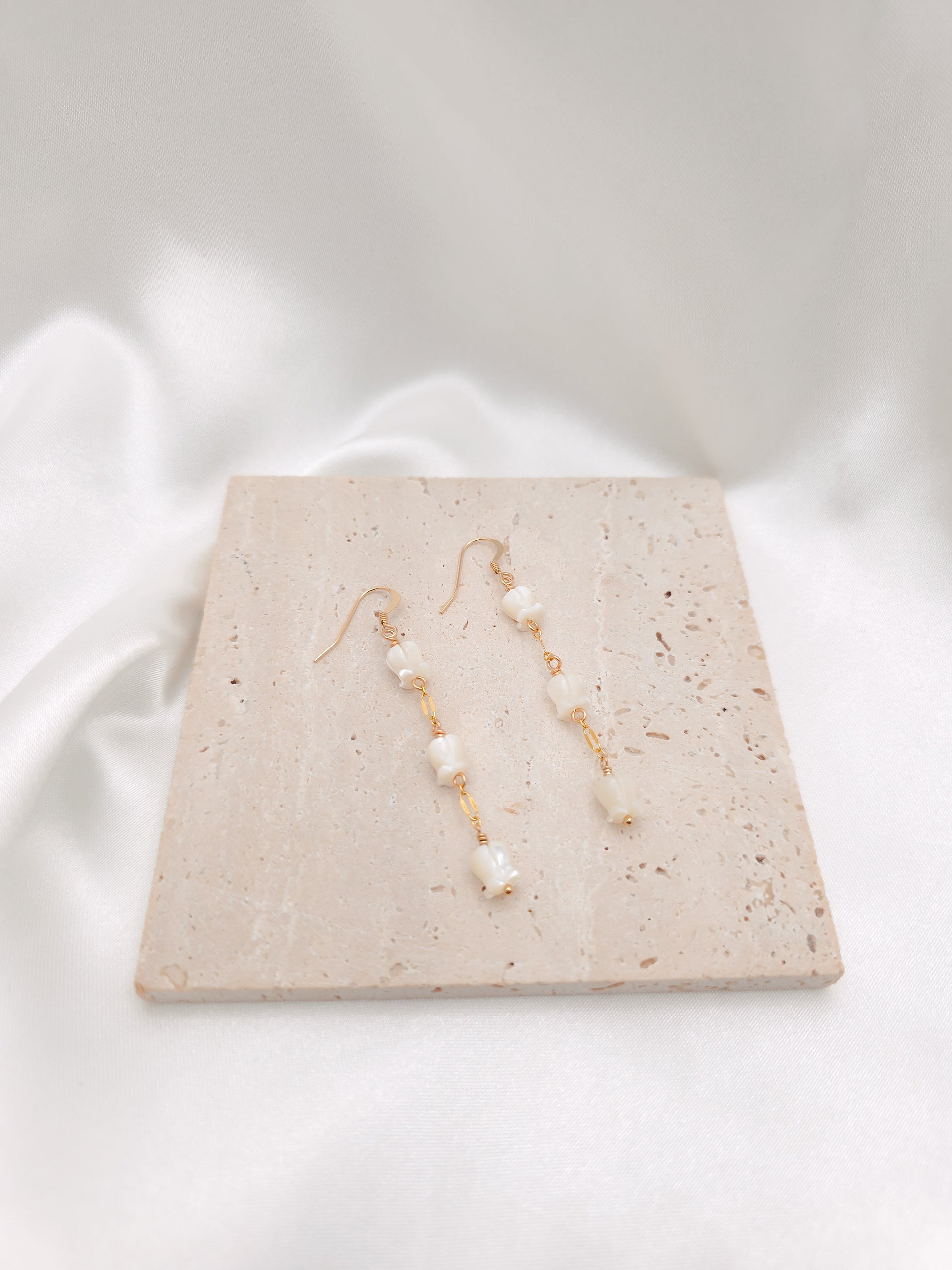 Earring is made with gold-filled or sterling silver ear hooks and Mother of Pearl crown flowers.