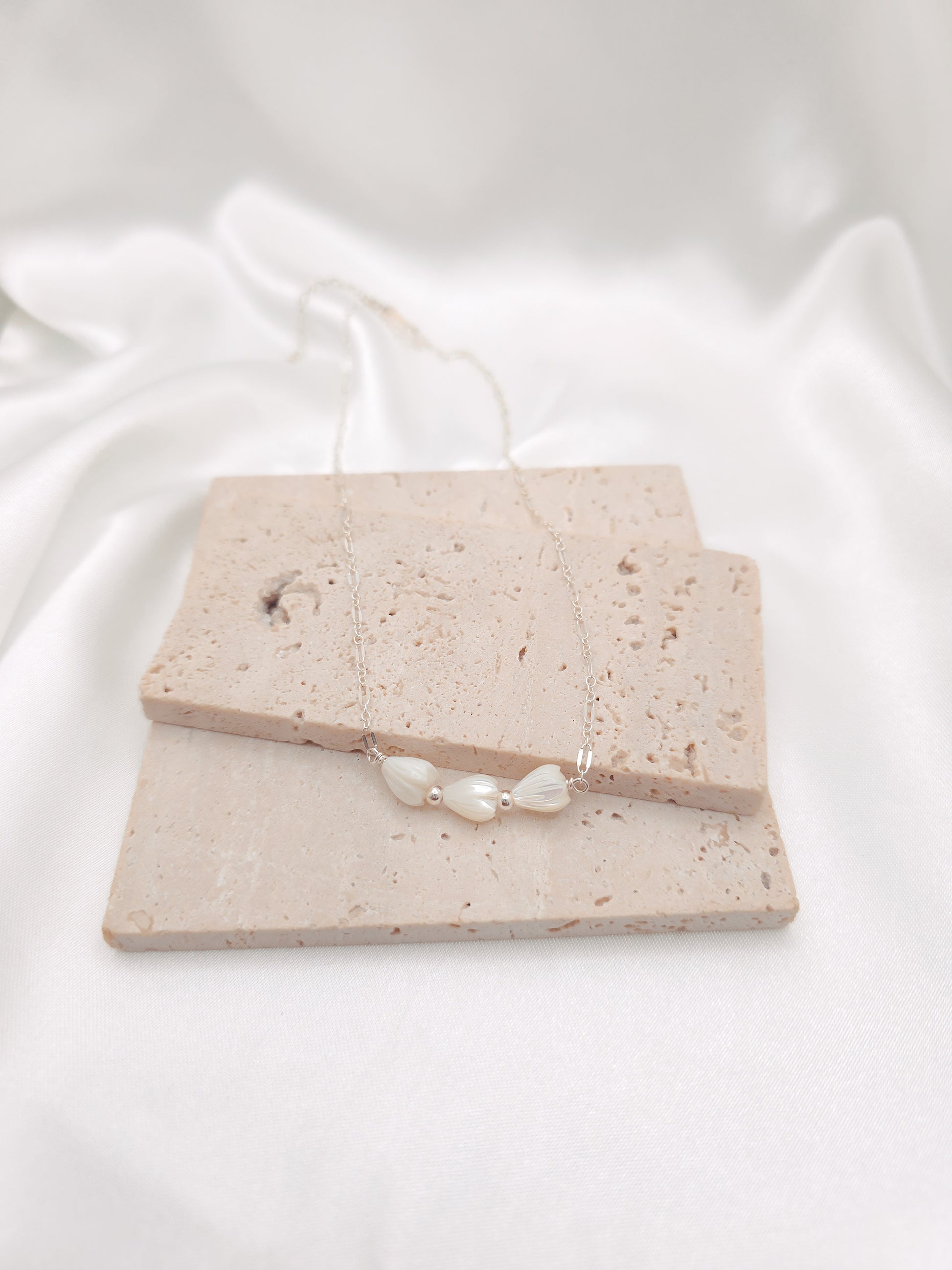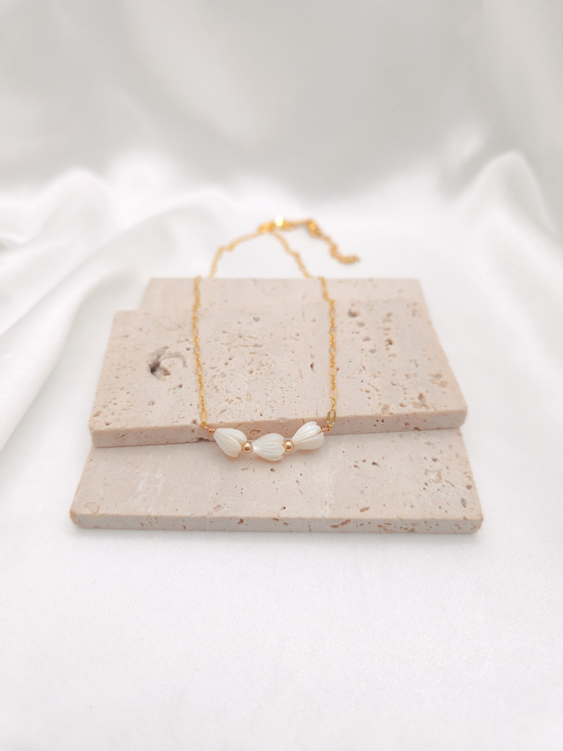 Necklace is made with a gold-filled or sterling silver chain, and three Pikake Mother of Pearls.
