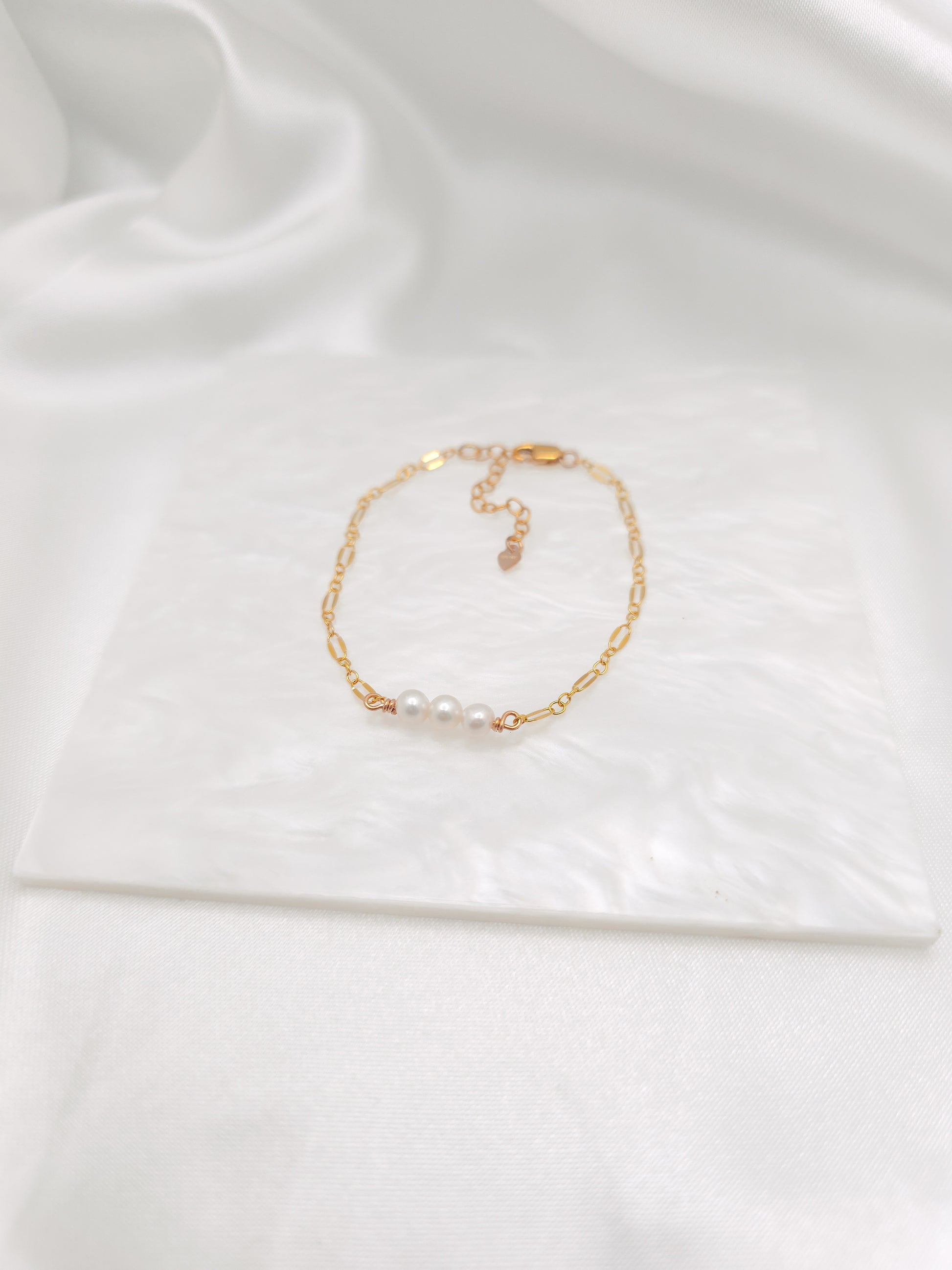Bracelet is made with a gold-filled or sterling silver chain and freshwater pearls.