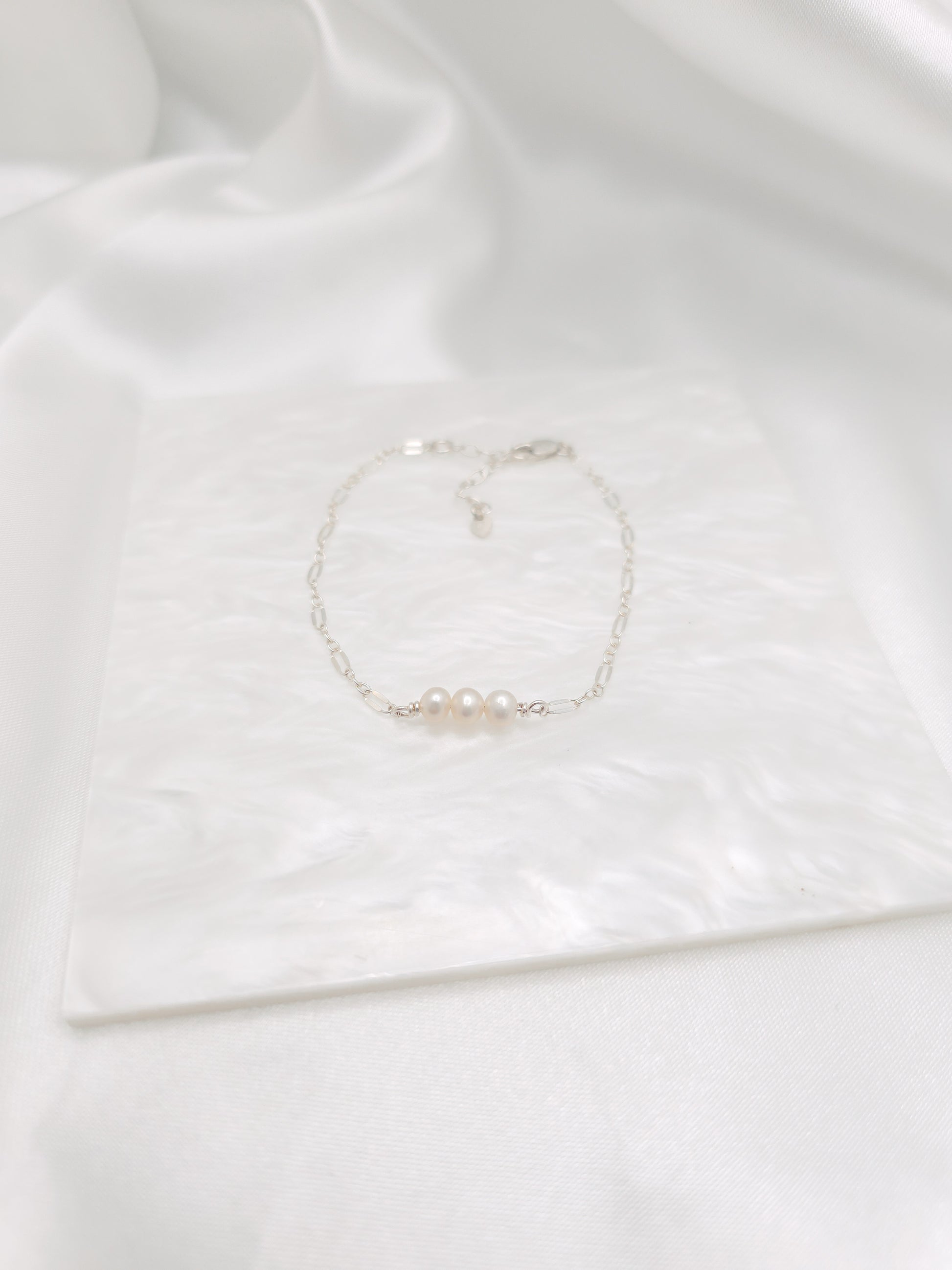 Elegant and stunning, the lacey pearl bracelet offers three white freshwater pearls on a simple chain.