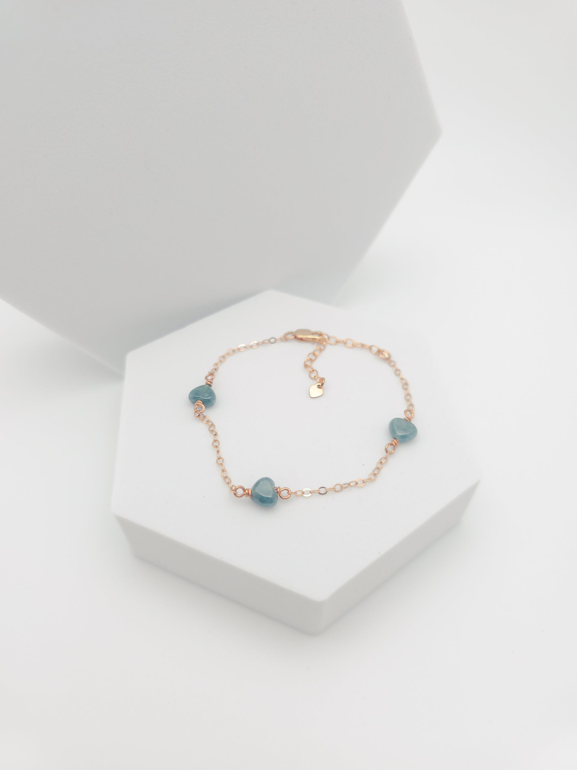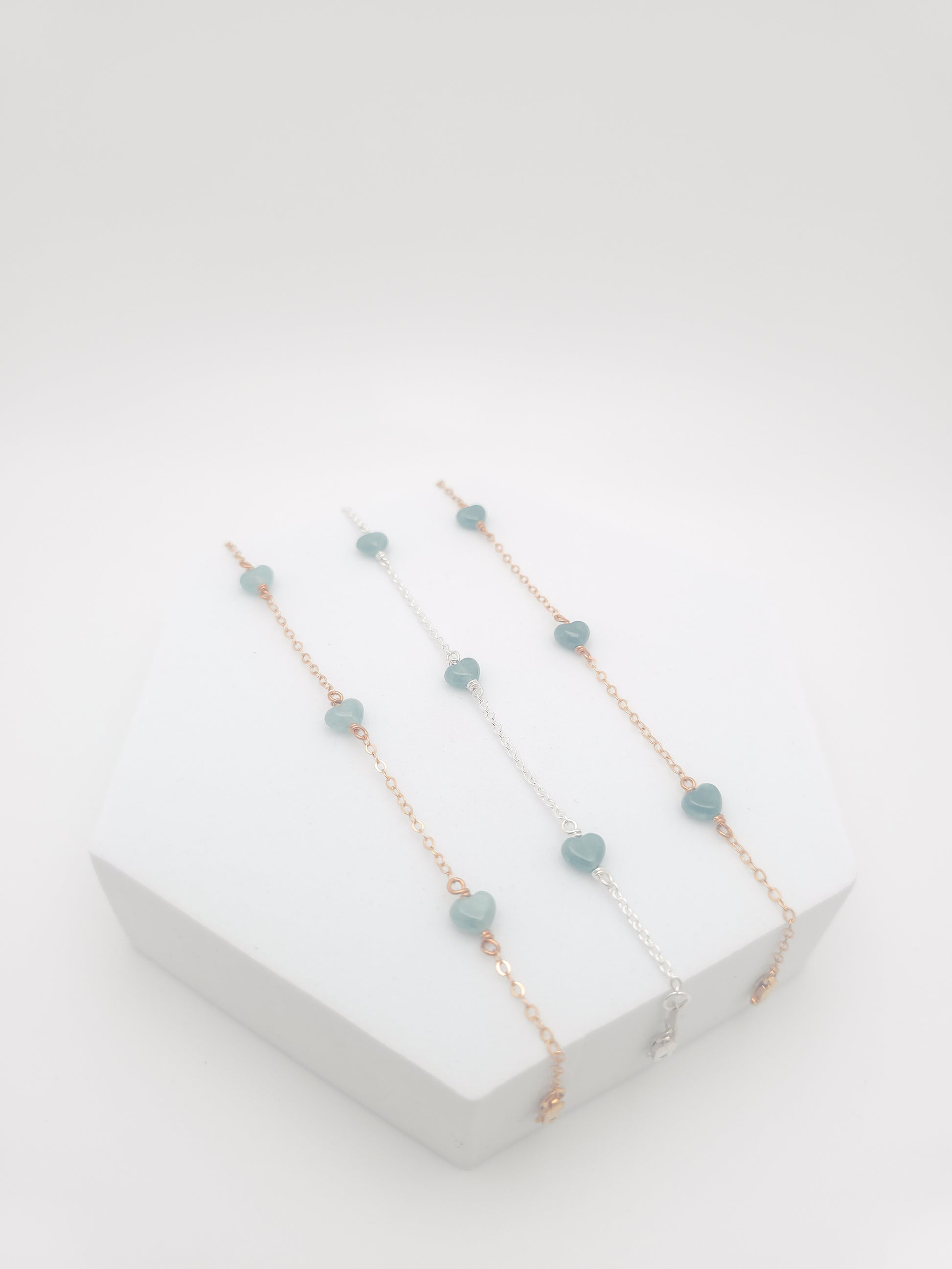Bracelet is made with a gold-filled or sterling silver chain, and Jade hearts.